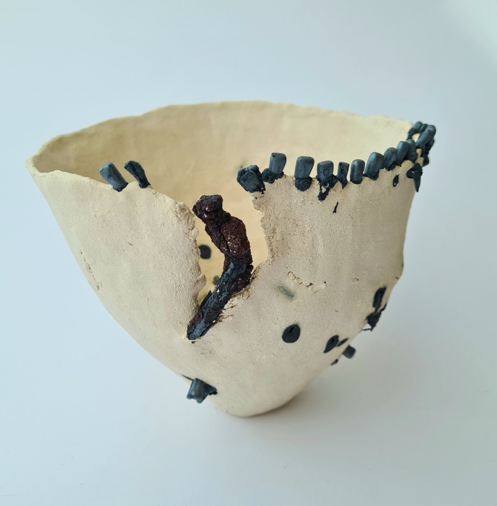 Jacy Wall has been creating ceramics incorporating different materials, including some from a collection of historic nails assembled by her partner artist Brian Rice during his renovations of their house. She’s fascinated by the effects created when the metals are fired along with the pots.