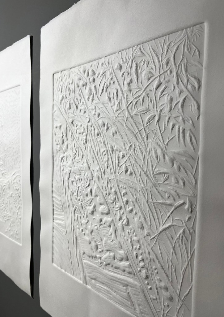 Vestigia is a composite installation created with paper embossed linocuts by Juliette Losq. The title comes from the Latin for “footprints or traces”, and is intended to suggest the way in which we now encounter the buildings and defunct machinery that once comprised Exeter’s paper mills. Many of these structures are hidden and may be discovered along walking routes once trodden by former mill workers.